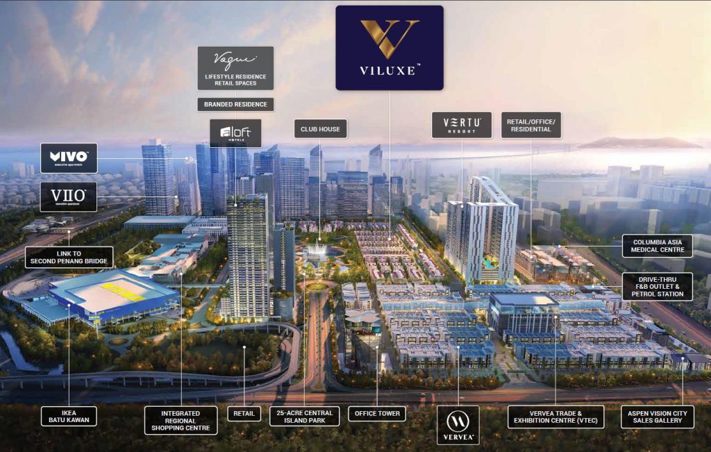 Conceptualised for the privileged few that appreciate the finest things in life, Viluxe is the one and only Freehold landed residence in Aspen Vision City and occupy the utmost centre of the project masterplan. Strategically located fronting the 25-acre Central Island Park, Viluxe is conveniently connected to other Aspen Vision City components including IKEA Batu Kawan, Integrated Regional Shopping Centre, Vervea, Vertu Resort, Columbia Asia Medical Centre, Aloft Hotel and much more.